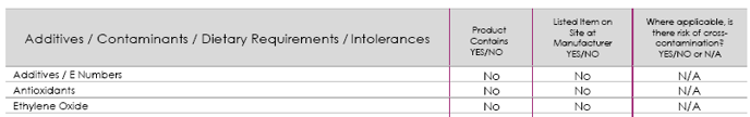 Confirmation that a product does not contain Ethylene oxide (ETO) can be found on the product technical dossier in the Additives / Contaminants / Dietary Requirements / Intolerances table.